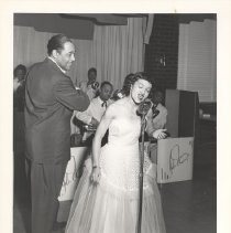 Photograph of Mahalia Jackson singing as the band plays and Duke Ellington looks over his shoulder at her, undated